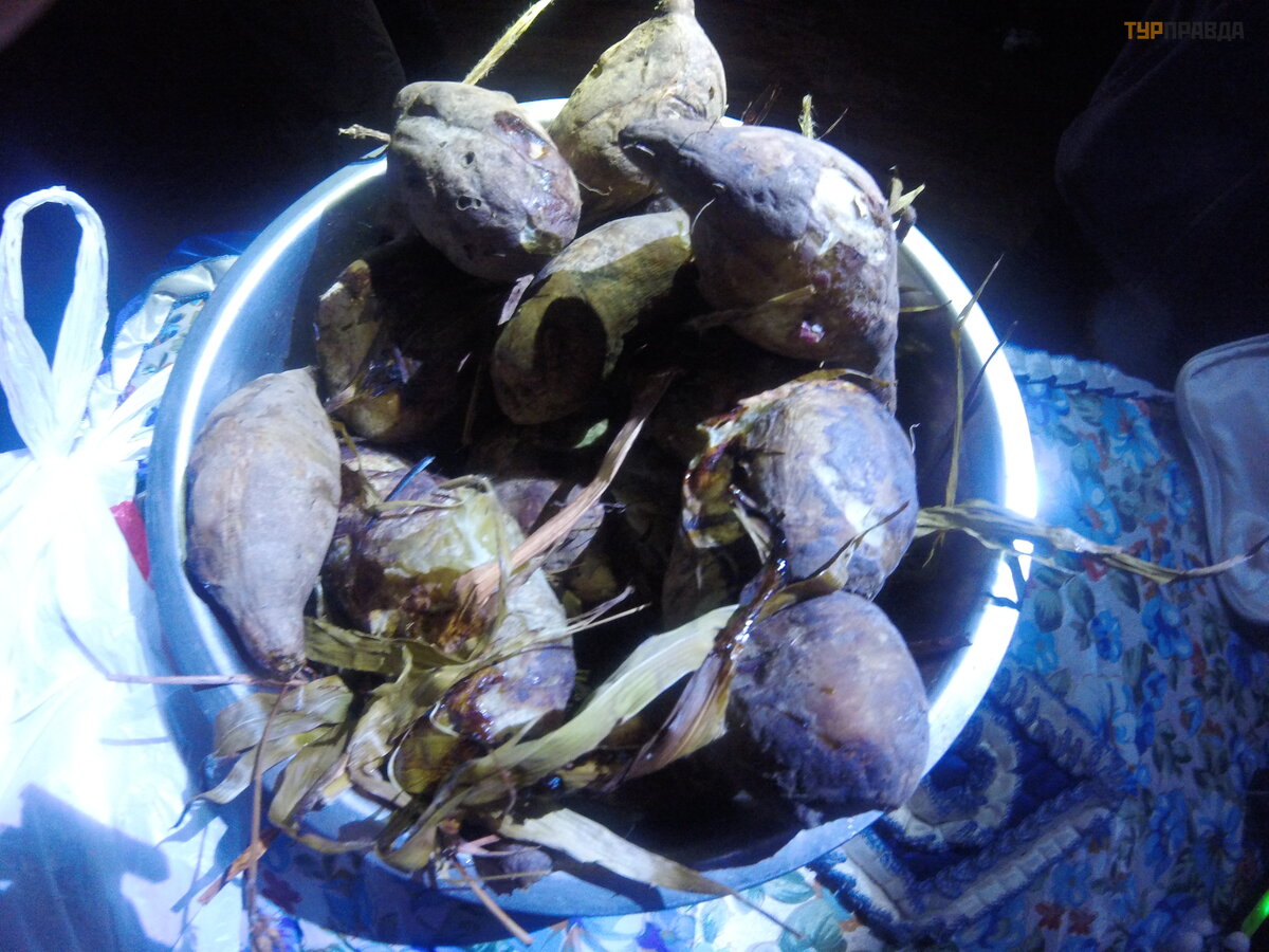 It gets dark very quickly at 18:00, we barely had time to put up the tents. We went to the locals in the village to eat. A woman who doesn’t even know how old she is cooked yam (sweet potato) and boiled leaves of this vegetable for salad, since we had oliya, salt, a lot of sauces, bread and even lard, I liked dinner. We made her a sandwich with black bread, mustard and lard, she ate, she spoke deliciously.