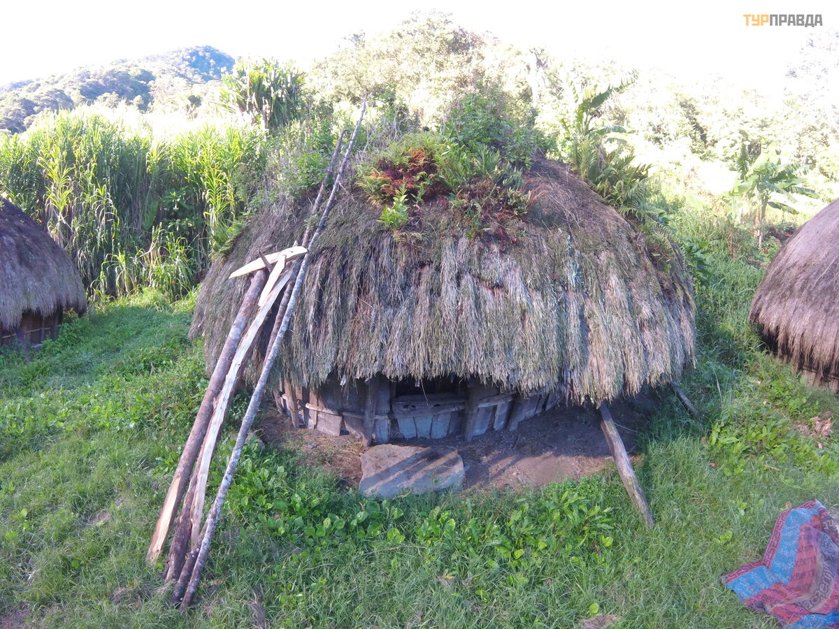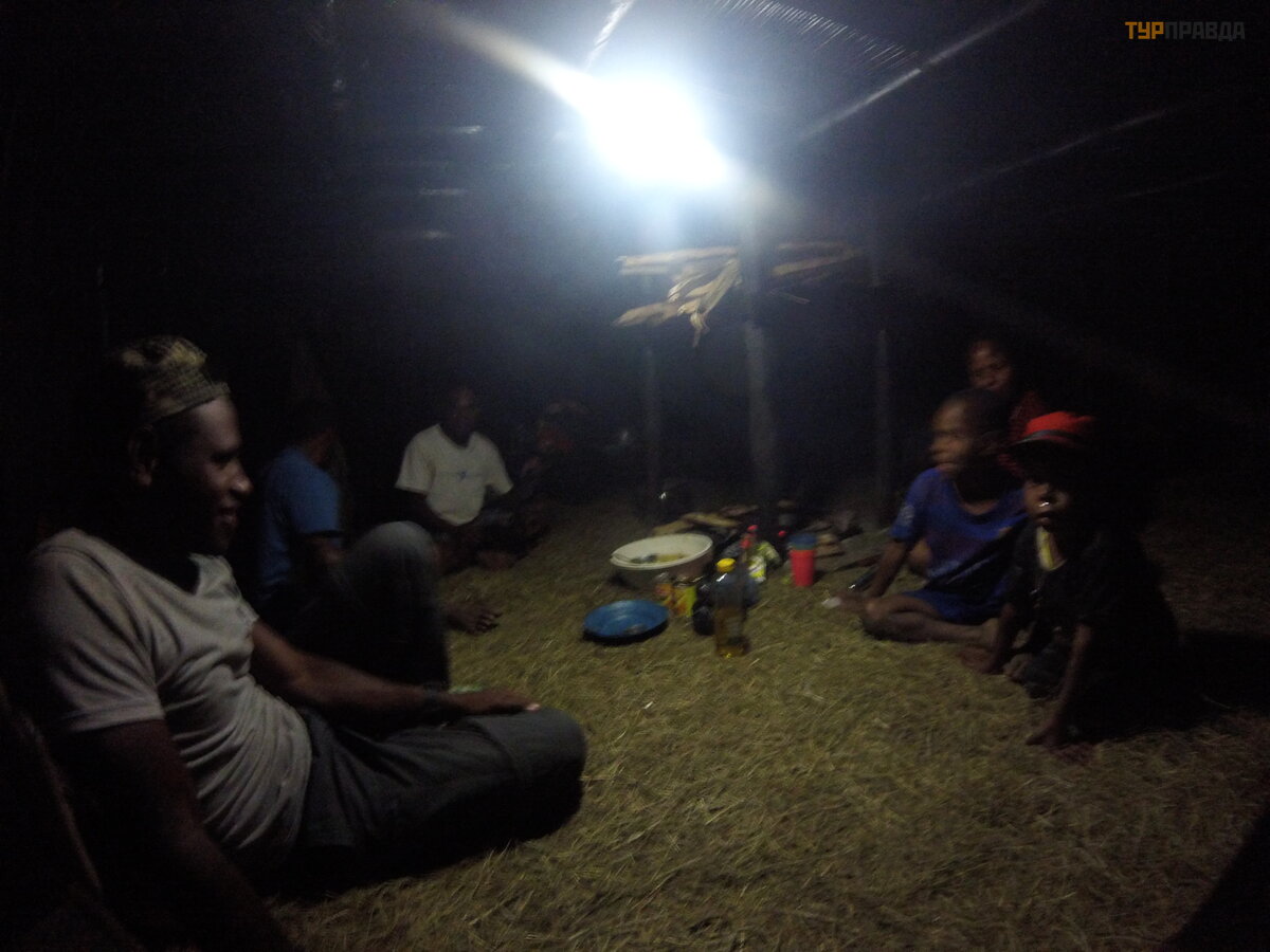 they called their chief, he talked for a long time with our guides, or he was waiting for some kind of benefit, or he wanted a lot of money, he looked at the women with interest, but still allowed it. Again we were given a wooden house, more comfortable than the last one, there was even one bed for everyone, but give us something exotic. I said that I would only sleep in hanai, I want to live with the locals and everyone agreed, all of them were 4 people, the guides again slept in a tent. What is hanai? This is a straw hut, straw walls, a straw roof, half straw, a hearth in the middle, they eat on the first floor, and sleep on the second. In this house, everyone slept on the ground floor. When we arrived, they were having dinner. A family of 7 people: mom, dad and a little less, then at night more teenagers came running, you can see their older children, no one fed them and it’s not clear how many of them. In general, about 20 people slept in this hut-small, and so many more could fit. Just started to fall asleep, a girl jumps up,