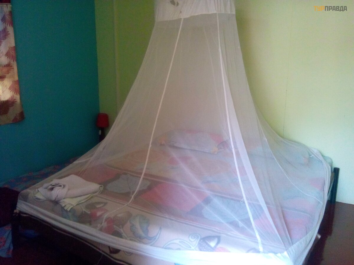 We were met by a boy, whom I handed a voucher to. But, apparently, he was never literate. An English-speaking aunt ran after him, trying to get something out of him. The boy is not hello. Then my aunt turned to me. I said that I only speak Russian. Behind. The guy took us to show the rooms in the building. Opened one. Well, nothing like that, the room. I don't mind. Our hut is, in any case, cheaper. But there is only one bed, although it is a king size bed. I began to explain to him that there were three of us, and one bed. It is unlikely that he understood what I meant, but opened another room with air conditioning. Then the third, with the kitchen. There is only one bed. Seeing that I was still dissatisfied, I began to call somewhere. The owner Agnelo rushed on a motorbike (I found his name on tripadvisor). Taking our voucher, led to the huts. There was only one bed, of course. Very big, but one. She asked where Verka would sleep. Big Boss said that he would put her separately, in a neighboring hut. Sure, not a problem! Verka, however, did not show enthusiasm about this. We look at the decoration of our homes. I don't know if you had to live in such "inhuman" conditions. A typical hut a la Melekino. But a bed with a mosquito net, which would be very useful in Melekino. But we didn't think of that before. And, most importantly, an individual bathroom inside the premises. Very poor, but still. A washbasin, a toilet bowl, a hose for washing intimate places, and a shower sticking out of the ceiling. The floor and part of the walls were upholstered either with oilcloth or with linoleum. There is a hole in the floor for draining water. The conditions are Spartan, however, in many boarding houses of the Azov coast, amenities are represented by a toilet-type toilet, one for all with all the consequences. And inflows too. .