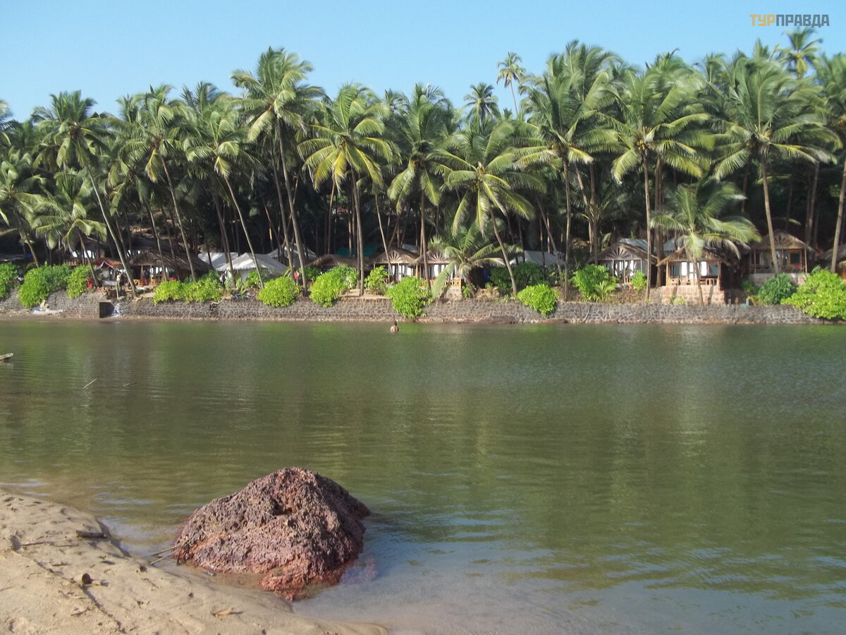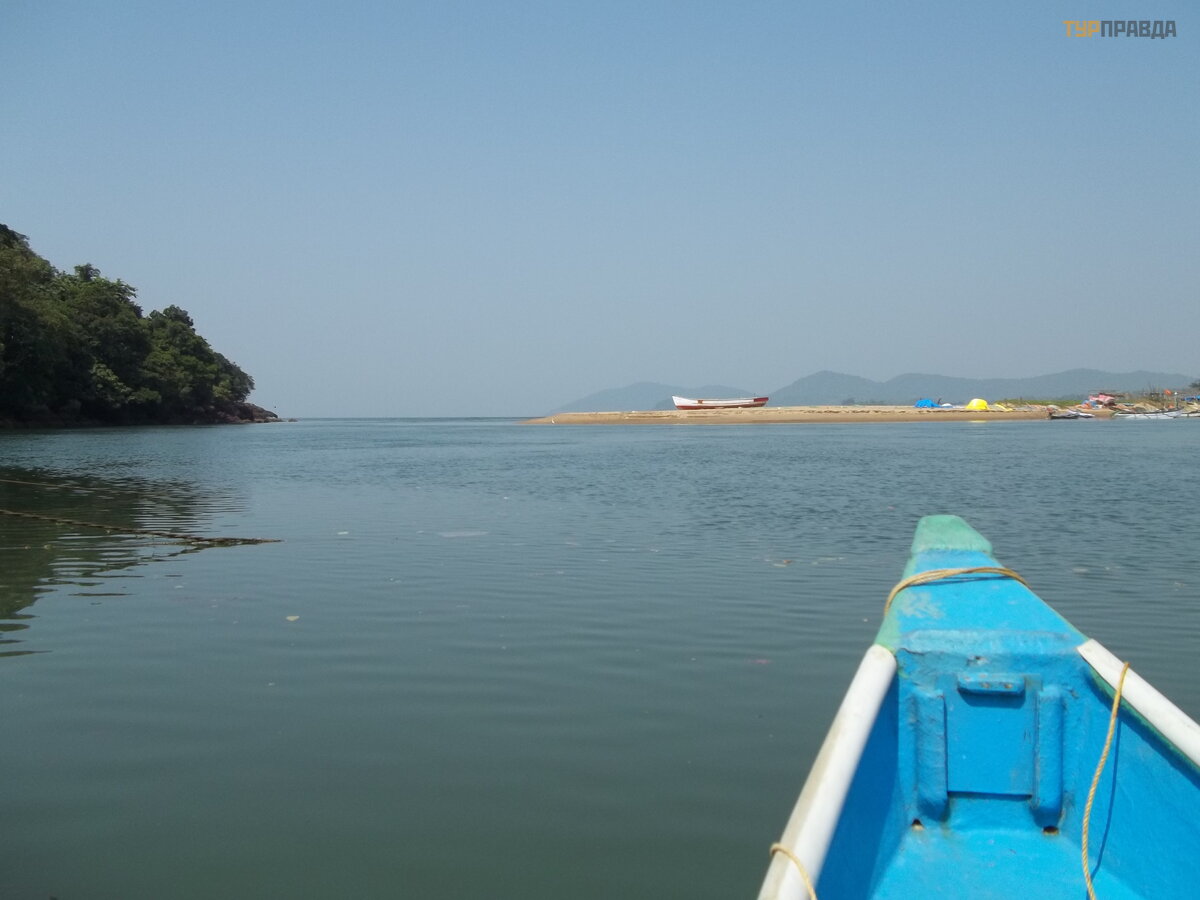 It was a little more fun here - fishing boats, a small temple and a few people. Even a couple of whites. A boy came up and offered us a boat. We refused. But then they thought about it and decided not to go back by bus, but to hire a boat and swim across the river of the same name with the beach, thus ending up on Rajbag Beach (where the cool Lalit hotel is). And there is already very close to Palolem. The boy brought us to the shore and wooed the boatman. For the crossing, he asked for 50 rupees from the bow. Without haggling, we climbed into the boat. Swimming there is nothing. Probably, it would be possible to bargain. Well, God bless him!