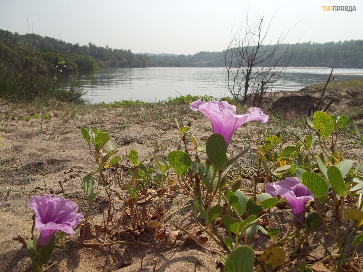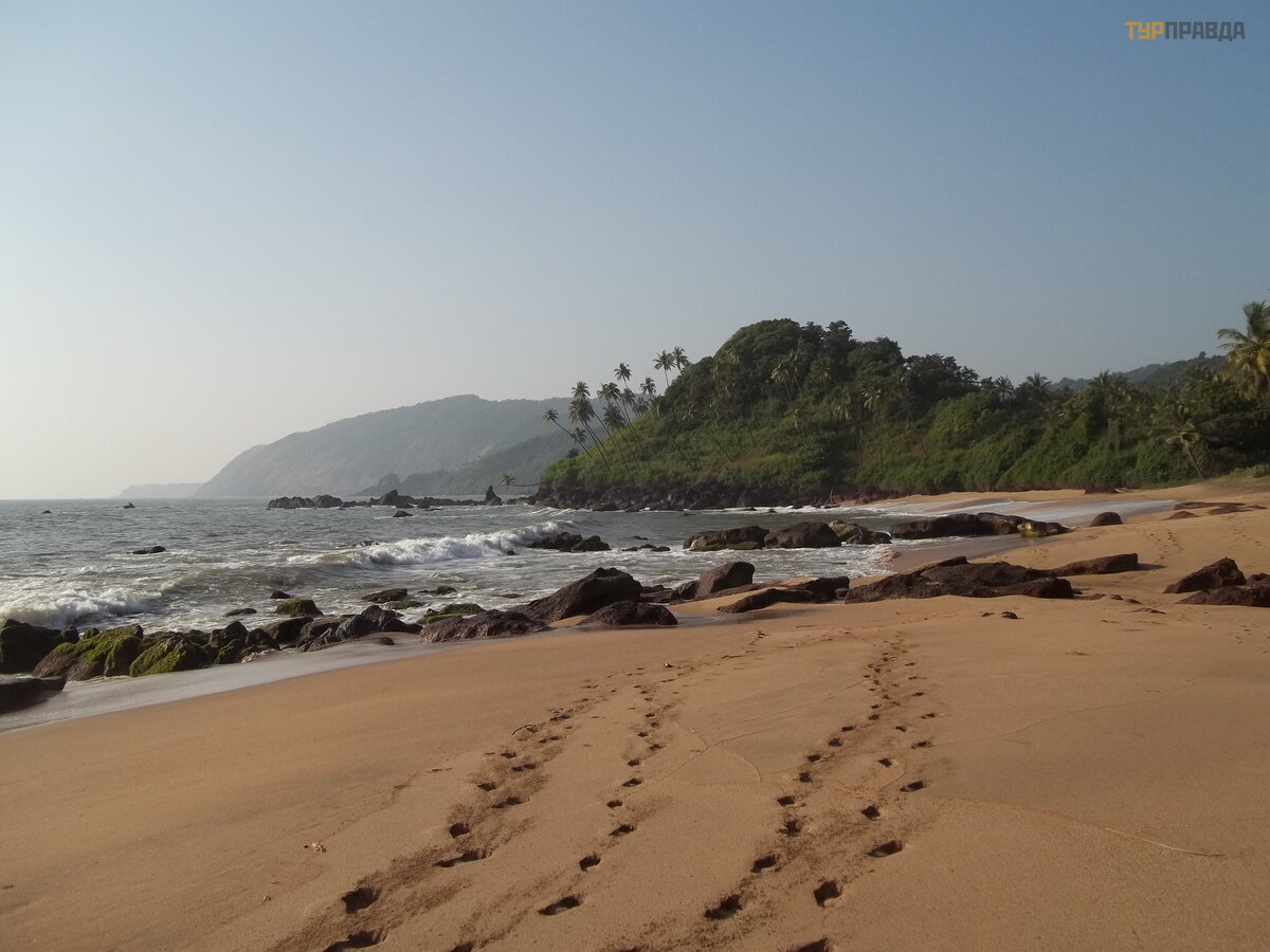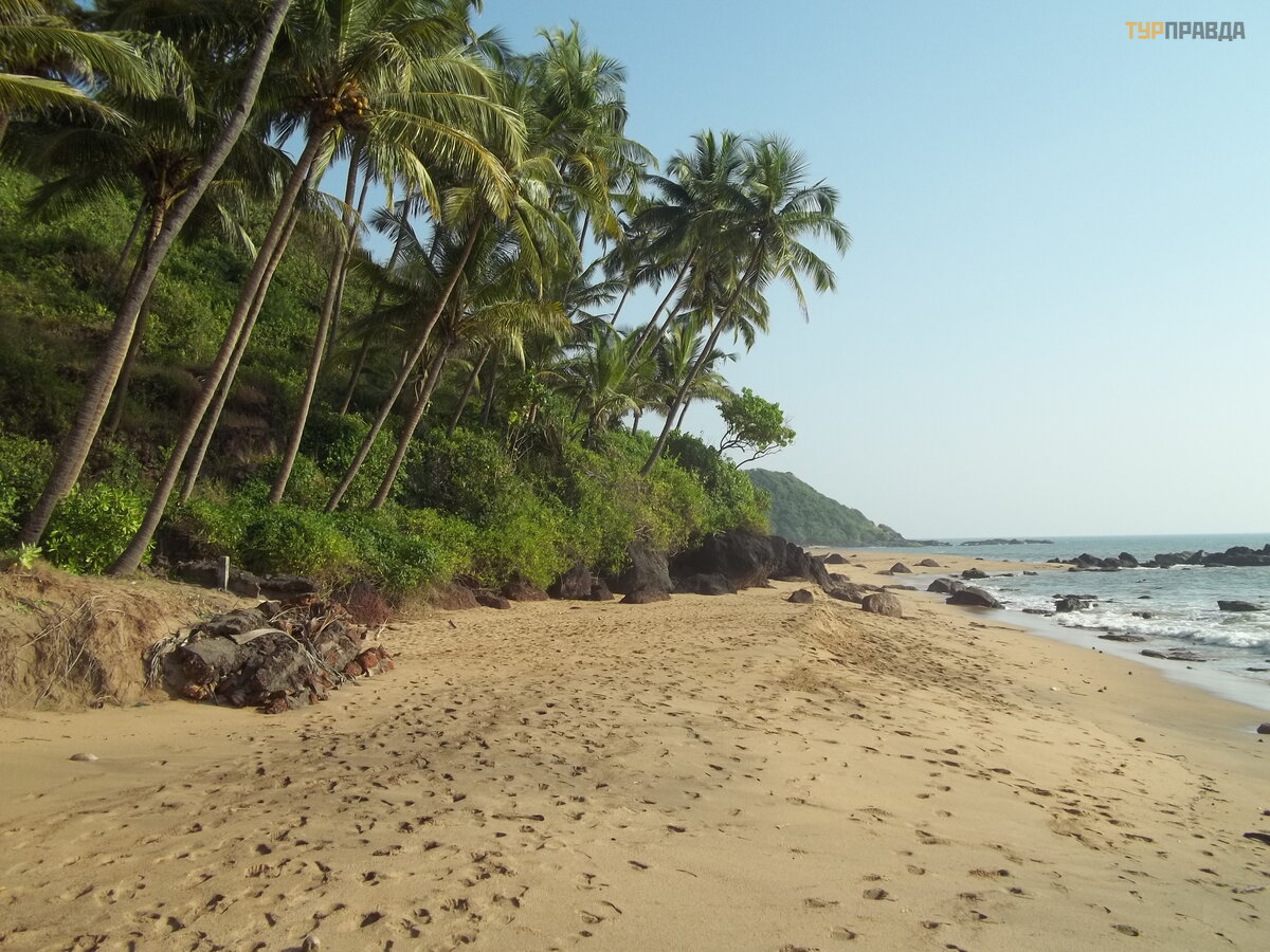 And about five rescuers jumped out of the booth! Who is there to save? Well, apparently, us! As we walked north, a couple of them followed us steadily. But we were not going to swim, and they eventually fell behind. This beach seemed completely uncomfortable and unremarkable to me. And palm trees didn't grow here. But only funny local Christmas trees, like in Betalbatim. Having found a sprouted coconut, we decided to do our bit to improve the local landscape - we dug it into the sand on a hillock behind the surf line. Maybe at least one palm tree will grow.