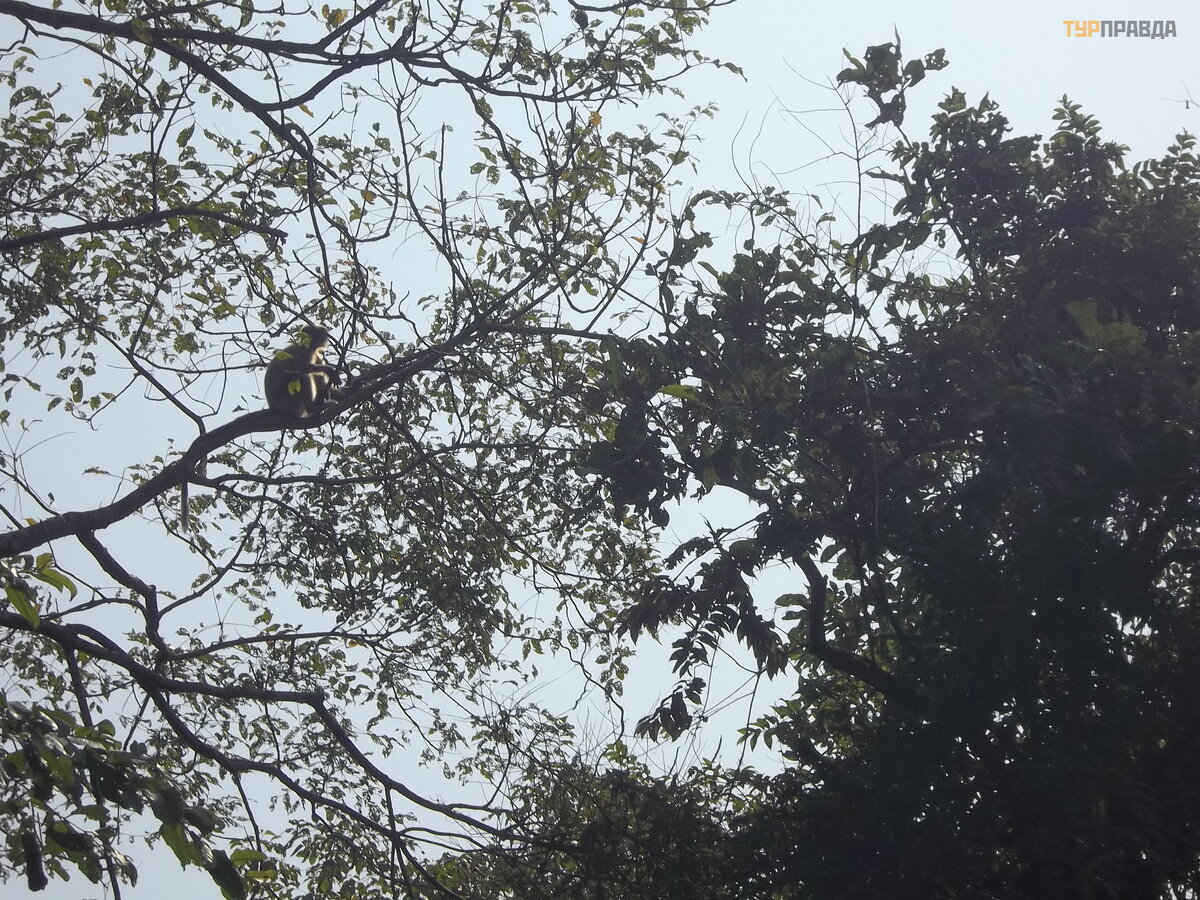 The path led us to the rusty carcass of a truck. And somewhere behind the trees, children's voices were heard. There must be people living here! We didn't go there and went back. On the outskirts of the village, the loud rustle of trees was heard again. There was a whole herd of monkeys jumping around. Now I managed to photograph them, albeit from a distance.