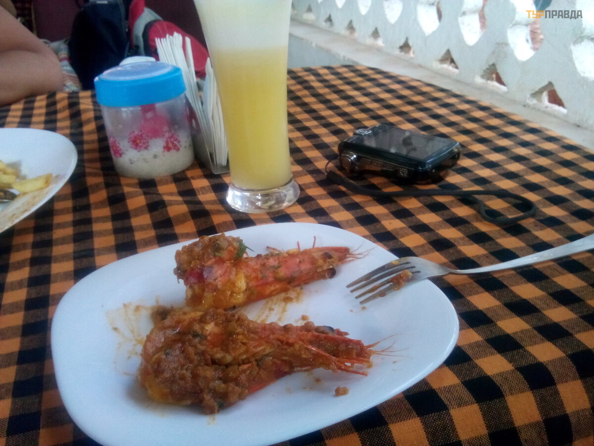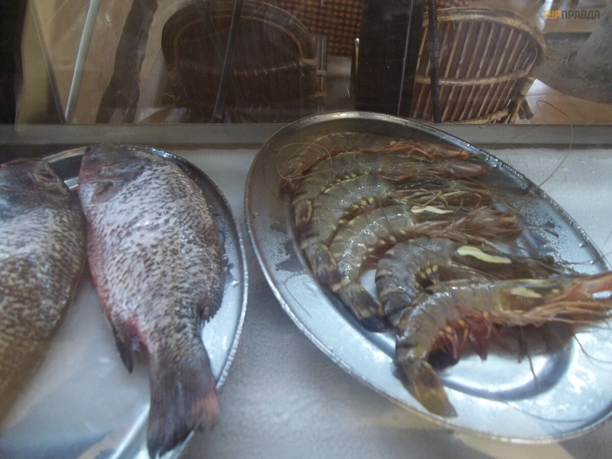 Today we decided to change the place of lunch and went to Fatima's cafe. Another female name! But no women were observed in any of the cafes we visited. We wanted to order something "tandoori" but were told that these dishes are only prepared after 6pm. Oops! We were offered to see seafood. There were tiger prawns in the window, or maybe not tiger prawns. Some of them were not very striped, but large.