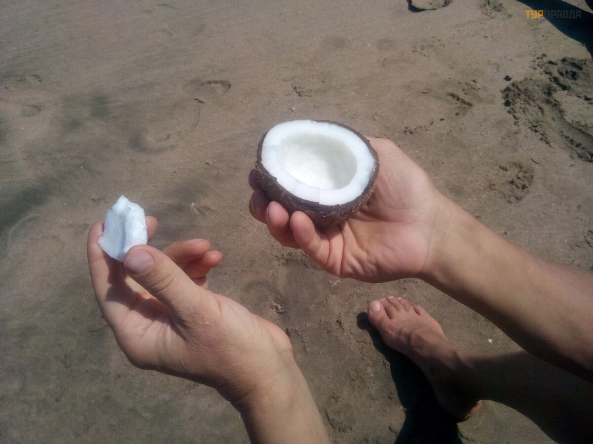 First, it was necessary to peel off the copra, get the kernel of the nut, then punch a hole in one of the three recesses and drink the juice. After that, you need to break and peel the shell, and voila! Here it is, heavenly pleasure!
