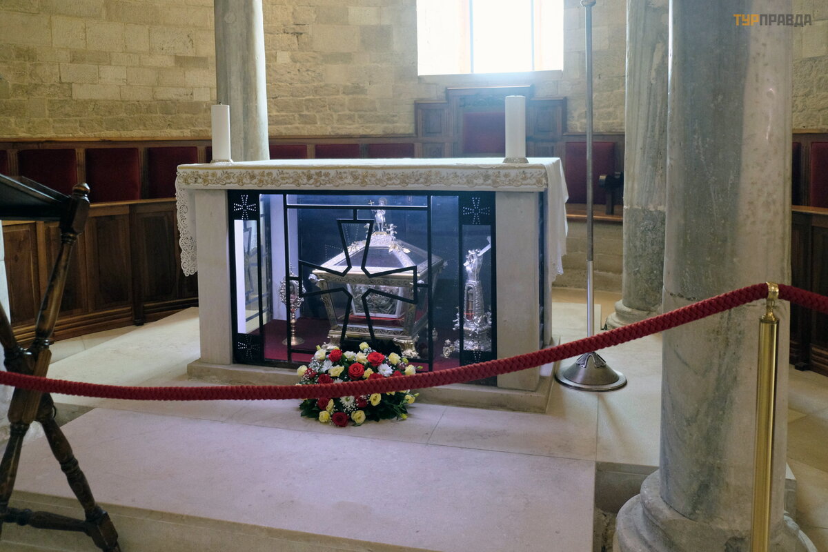 In the crypt of the relics of the city's patron Saint Nicolo Peligrino (Pilgrim), canonized after his death in 1094.
