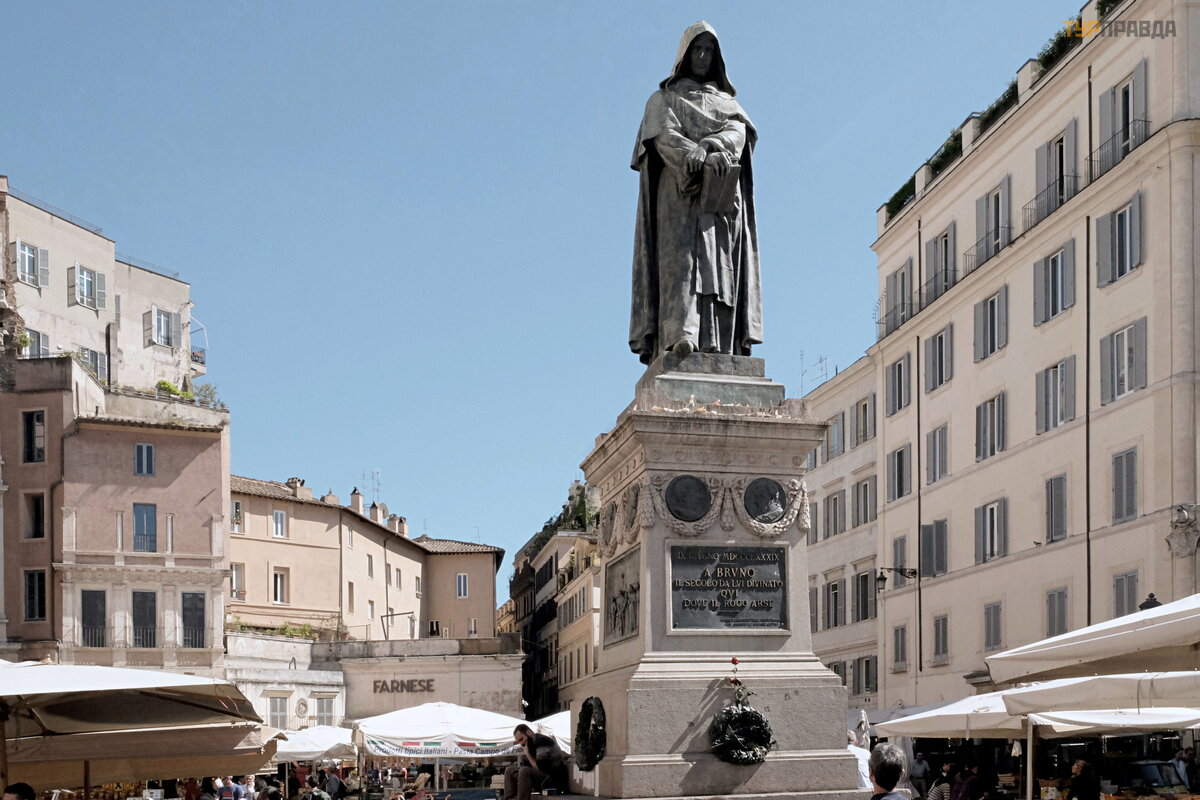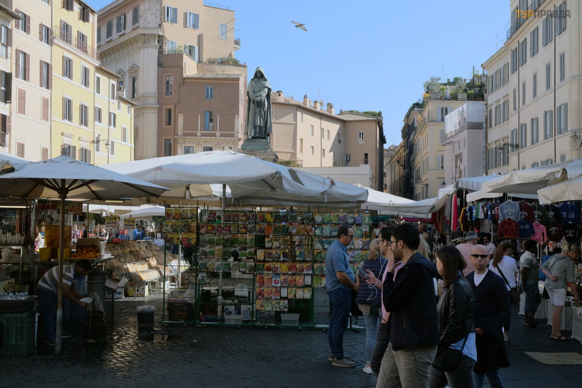 In the middle of the market is a monument to Giordano Bruno, at the site of his death in the fire of the Inquisition.