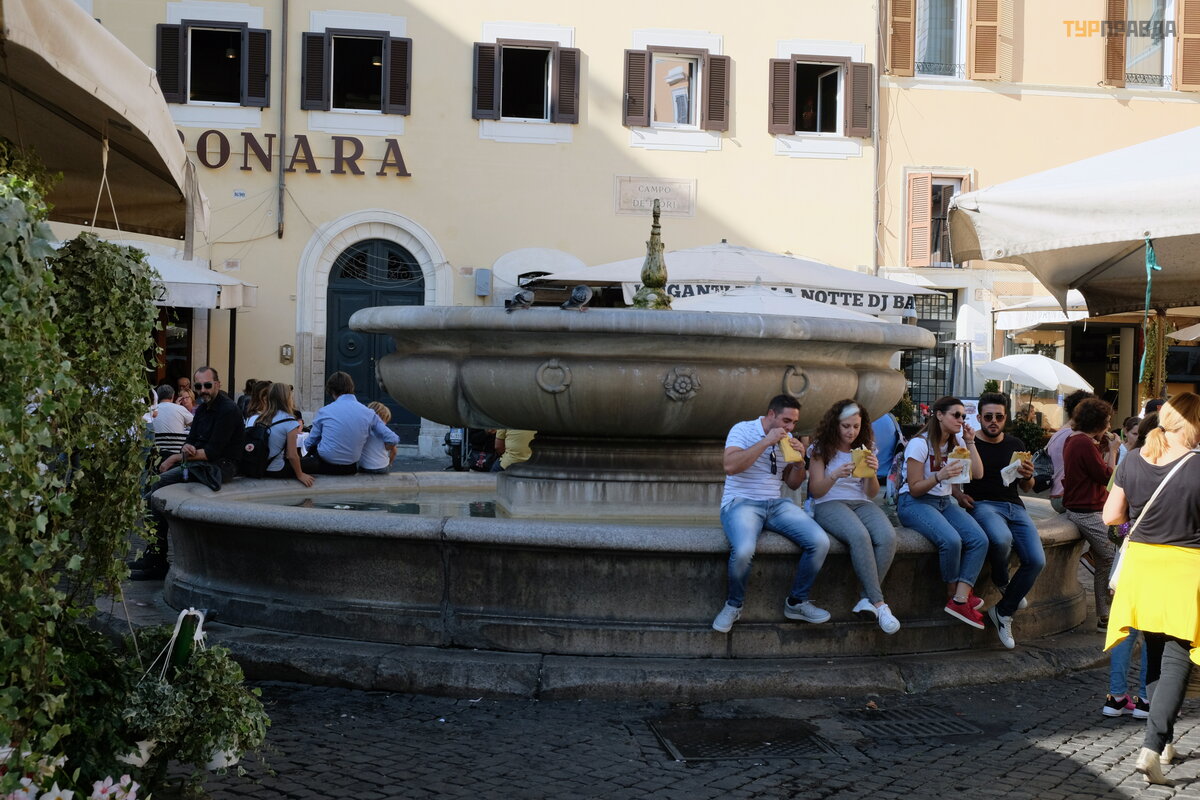 Here is Campo del Fiore, the only historic square in Rome that doesn't have a church. But not a single square is complete without a fountain; this fountain was donated to Campo de Fiori by the City Hall of Rome in 1898. It is an exact copy of the old fountain of the 16th century, destroyed for some reason.