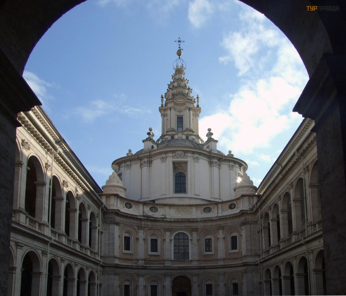And above it all rises, screwing into the sky, the magnificent spiral of Borromini, the spire of the Church of San Ivo Sapienza, the Church of the University: