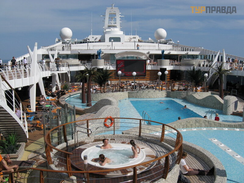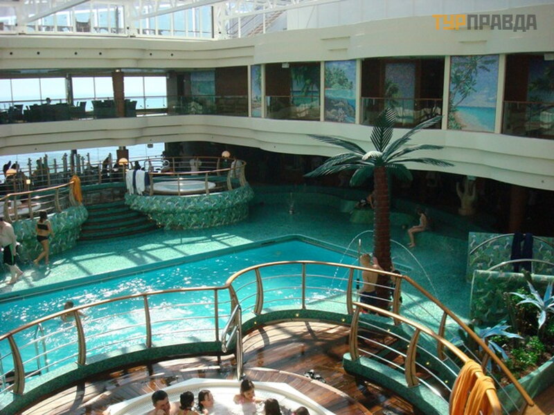 And we, while there is time, a walk around the liner with its shiny exterior and interior. We walked along the outer deck to the central pools (there are open and under a sliding roof). Sometimes I insert not my own photos, but to make it connected.