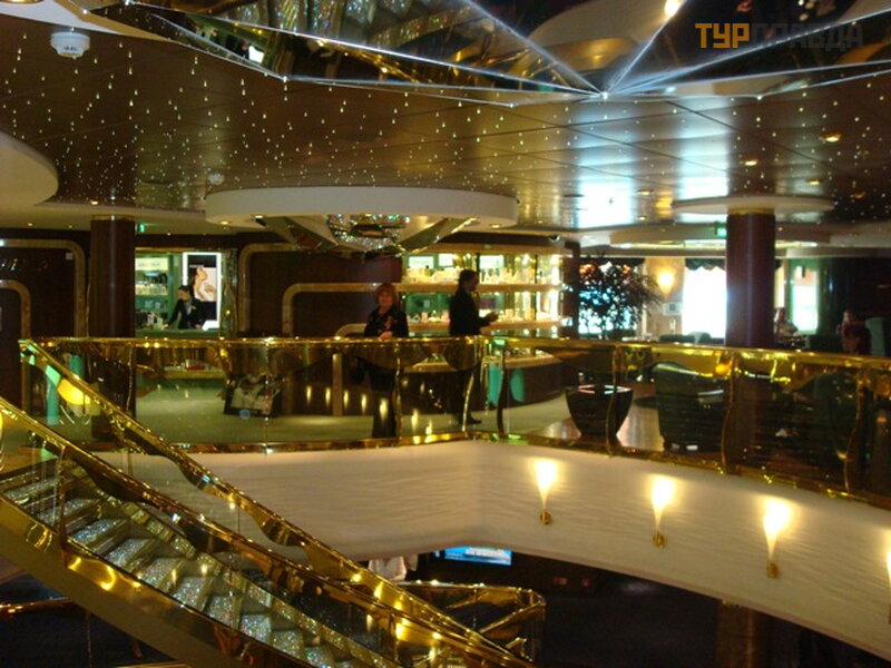 There are two main restaurants on the ship - at the stern "Villa Verde", our restaurant "La Reggia" - in the center of the ship. We decided to stop by for an idea of the Villa Verde restaurant and went down to the 6th deck. He impressed, then in my concept I have to go to the center to the atrium and go to our restaurant. It seems easy, but we go to the center of the ship - a dead end, went down to the 5th deck, again a dead end. It turns out that it is impossible to walk along these decks from the stern to the center and bow of the ship. We went up to the 7th deck, through the photo gallery and the wine cellar we reached the atrium, and down these shiny steps we went down to the entrance to our restaurant.