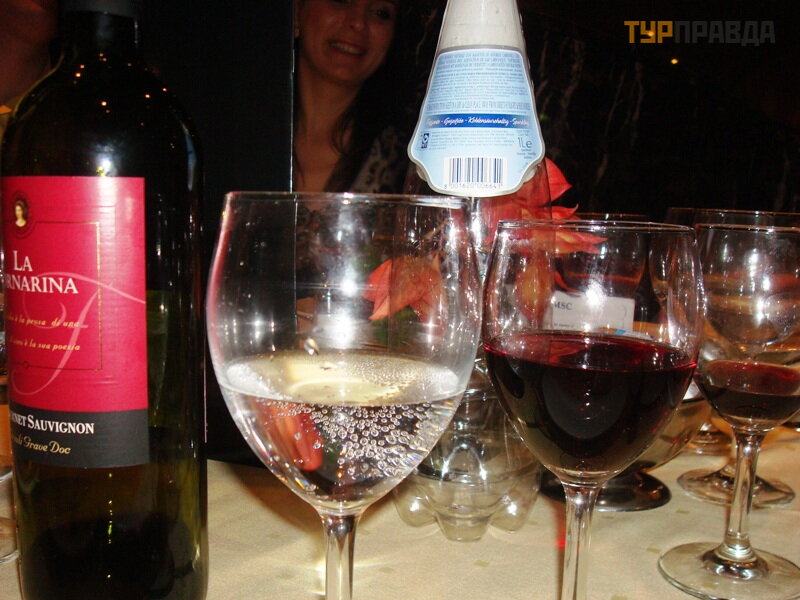 It was decided to take a bag of wine and water, as we already know that it will be more expensive if taken separately. It contains four bottles of wine (two white and two each) and six bottles of mineral water, with a tip for the waiter of 90 euros. Thought - "not weak. " Considering that we dined not so long ago, we didn’t particularly strain ourselves (salads, veal roll, some kind of herbal green filling is wrapped in it, and there are seeds like melons, a dessert like cake, the women took ice cream). We dug into it under the vine, decided to go up to Pago-Pago, there are drinks, fruits, and there is ice for whiskey,