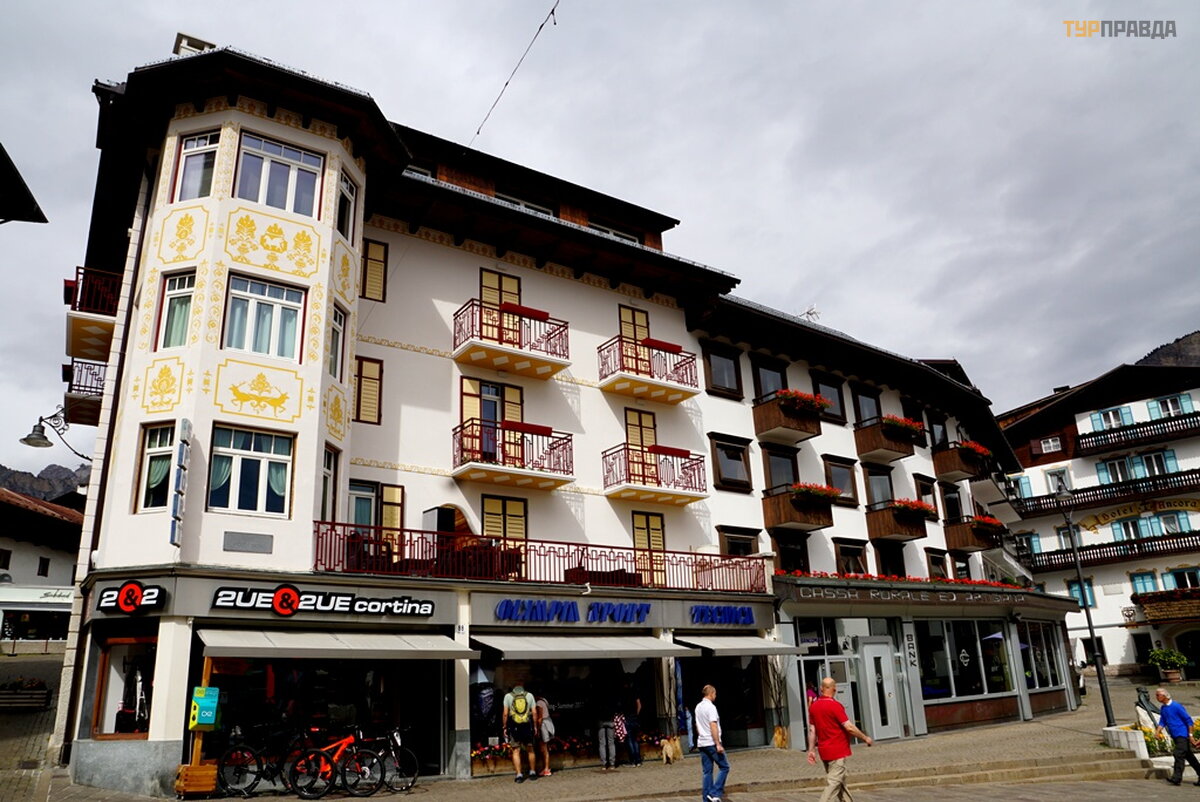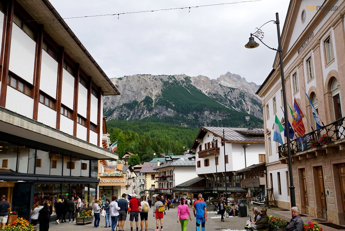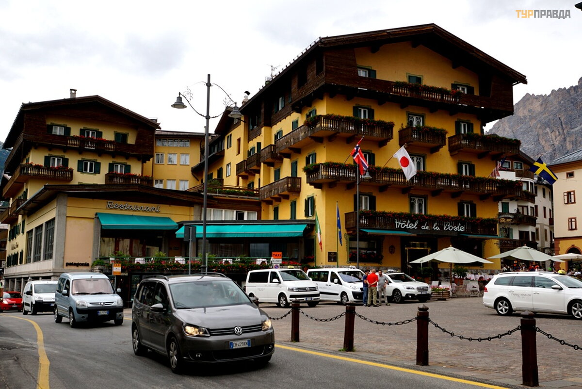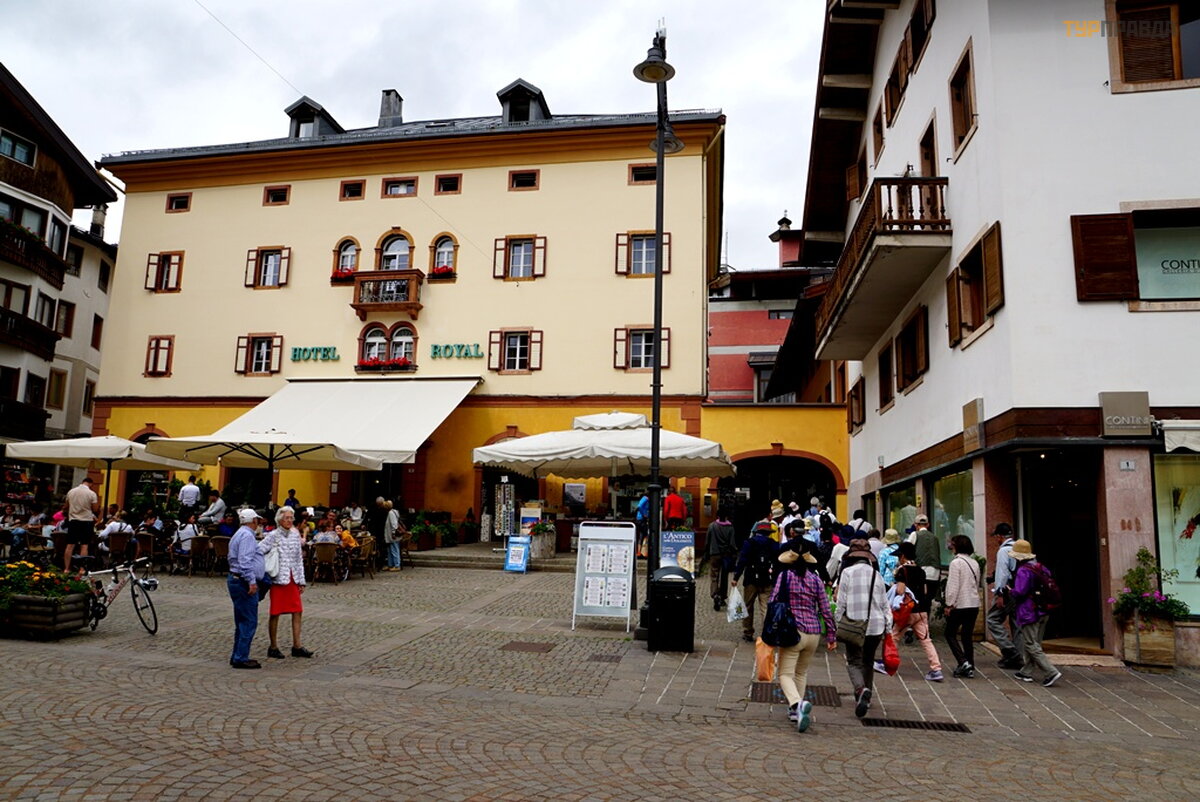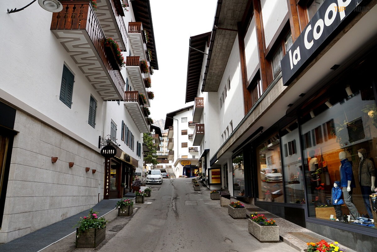 My first task was to find a hotel at a reasonable price for me with a parking lot. At first I thought it was easy, because it's not winter. Wrong. There are almost no places, and where there is, the price is about 8.000 rubles per night. Now I choose hotels carefully. If the windows of the room overlook the main street or square, then immediately refuse. If the number is a bar-restaurant, then I also refuse. If parking is under the windows, then this is terrible, especially when bikers come in and out, whose hearing is almost completely absent. Now I'm looking for a hotel in an alley, or a dead end street. With great difficulty I found a similar hotel for 7680 rubles. All bars have sandwiches and beer. I didn’t find good food with soup, and where there is good food, the price is within 60 euros. It’s good that I went to the supermarket before this town, where I bought the necessary products. He quickly prepared a hearty soup with herb spices, washed down with homemade Italian wine, and went out to get acquainted with Cortina di Ampezzo.