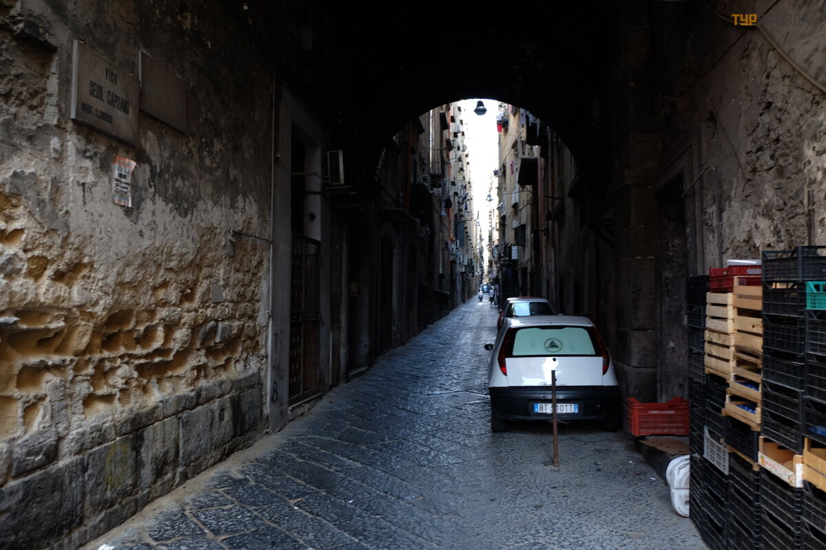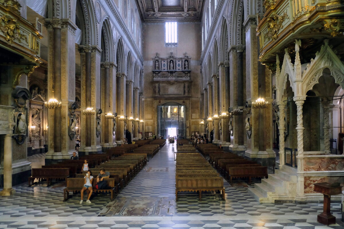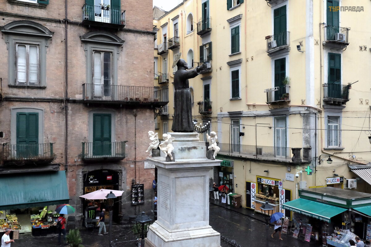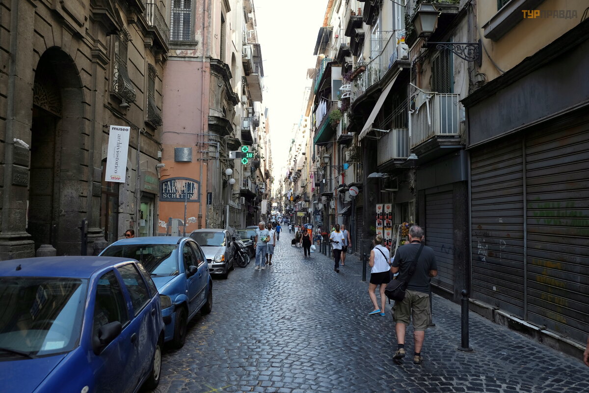 In the morning we took a tablet with a downloaded guidebook, a map and went to old Naples along the three main streets of the so-called. "Decumans", entering the temples, which are free in Naples. in the temples there is a riot of baroque: gold, paintings, jewelry. In addition, it was hot outside - 32 degrees. The main goal was the Chapel of San Severo (6 euros) with sculptures of amazingly precise work ("Christ under the Shroud", "Chastity" and "Getting Rid of the Spell" with a net carved by the sculptor inexplicably. In the chapel there are still many statues of relatives of Prince San Severo, who created a chapel, many of the figures are allegorical, it’s bad that the ministers not only forbid taking photos, but also don’t allow you to use a tablet - only an audio guide (there is no Russian language), you had to go to the entrance to the crypt and read there. In the crypt there are two mummies, a woman and a man with It is not clear to anyone how this was done 400 years ago, although the prince was fond of various chemical things and was known as an alchemist.