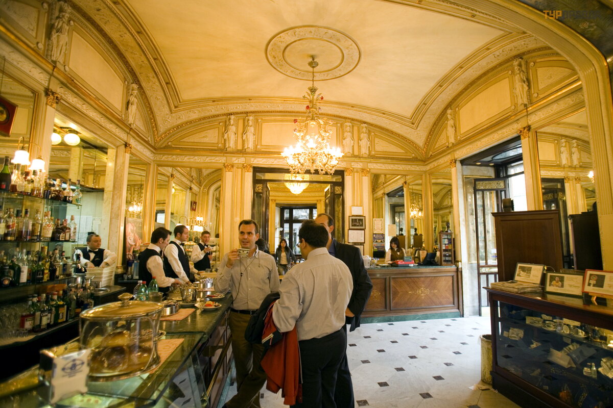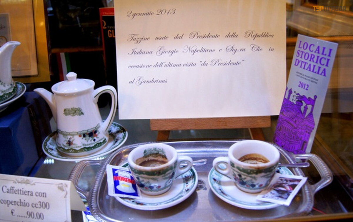 On the other side of the square is the famous cafe Gambrinus, which has been operating since 1860. Who was not there: Stendhal and Rossini, Oscar Wilde and Hemingway, Modigliani and Jean-Paul Sartre, Princess Sissi, and even Pope John Paul II, passing by, blessed the cafe. And these unwashed cups are on display after visiting the President of Italy with his wife.