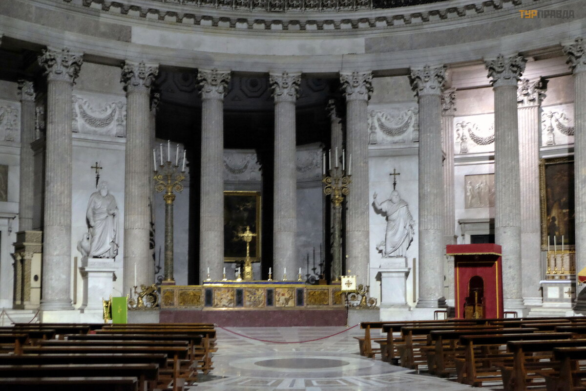 The temple itself is a strange hybrid of the Pantheon and St. Peter's Basilica with Bernini's colonnade. We then went to the church, inside it also repeats the Pantheon.