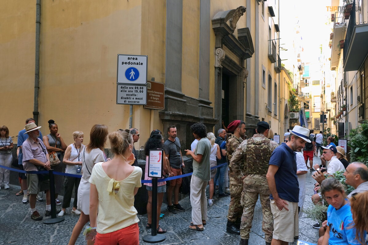 We reach the entrance to St. Anne of Lombard Church (Chiesa di Sant'Anna dei Lombardi), nondescript facade hides true treasures.