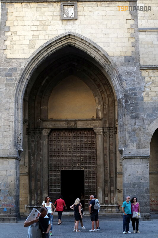 From the "decorations" inside the church of Santa Chiara - frescoes by Giotto, as well as the sarcophagi of the Angevin kings (predecessors of the Aragonese rulers). In the center of the rear wall rises the tomb of Robert of Anjou.