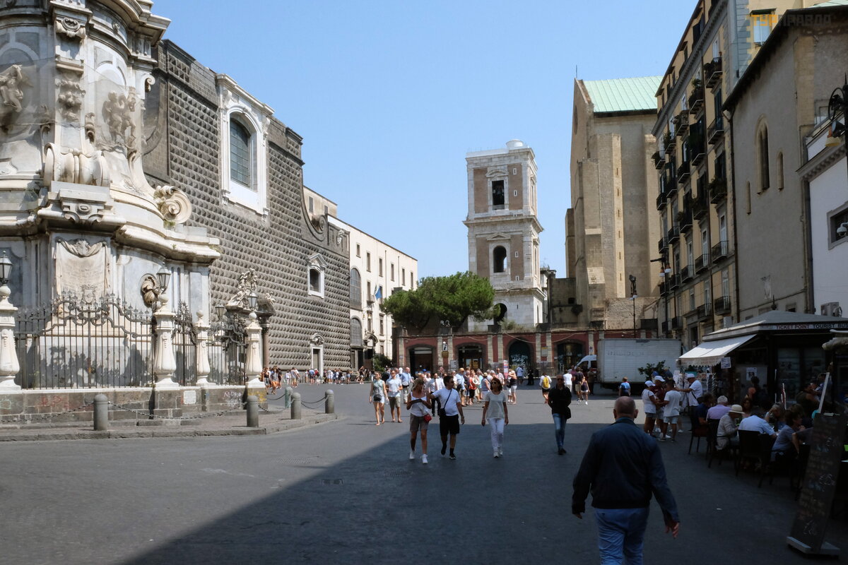 The church Gesu Nuovo (Chiesa del Gesu Nuovo) stands out in the square with an unusual facade of stone slabs in the shape of a faceted diamond.