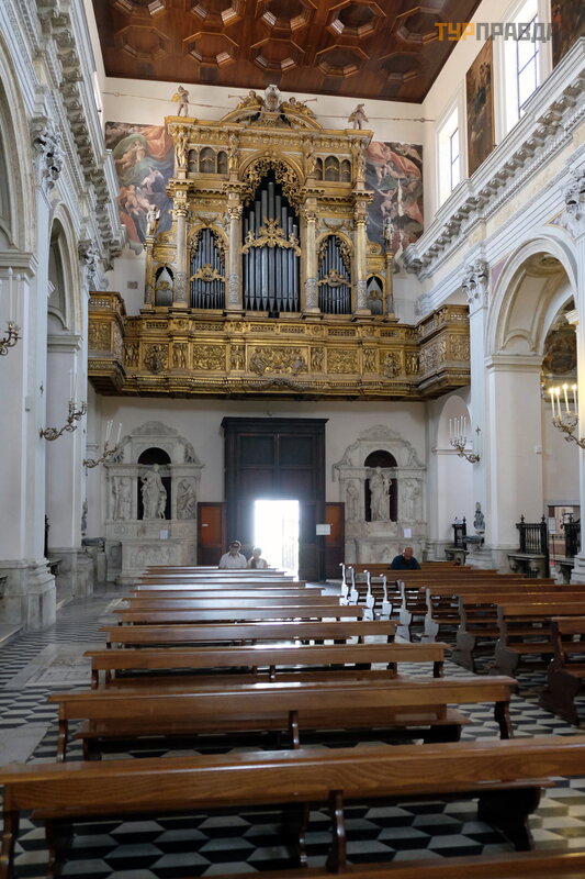The three-nave interior in the shape of a Greek cross is crowned with a dome restored after the earthquake of 1688