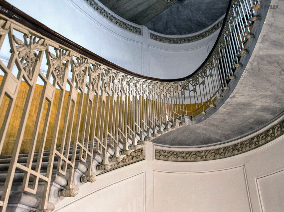 However, the main attraction is the building's cinematic covered staircase, a stunning elliptical creation adorned with wrought-iron parapets and embossed marble steps.