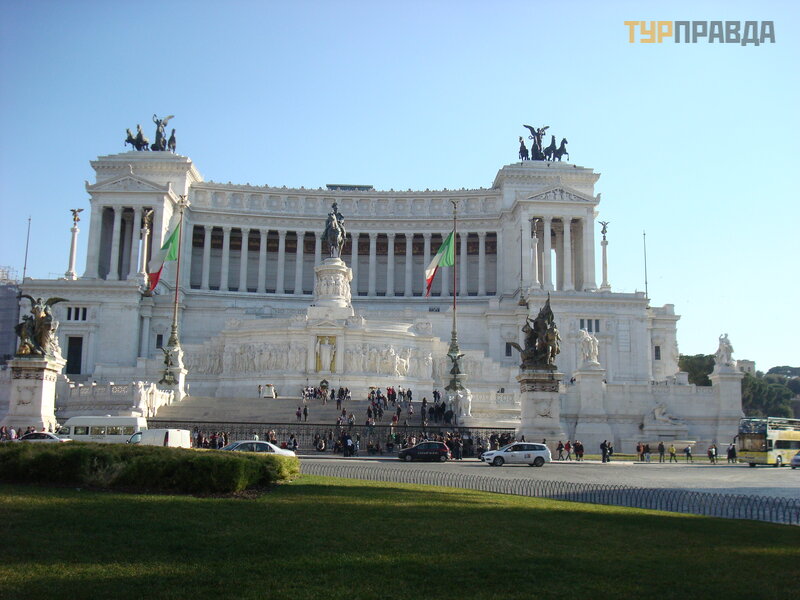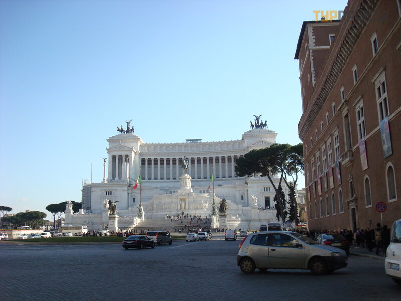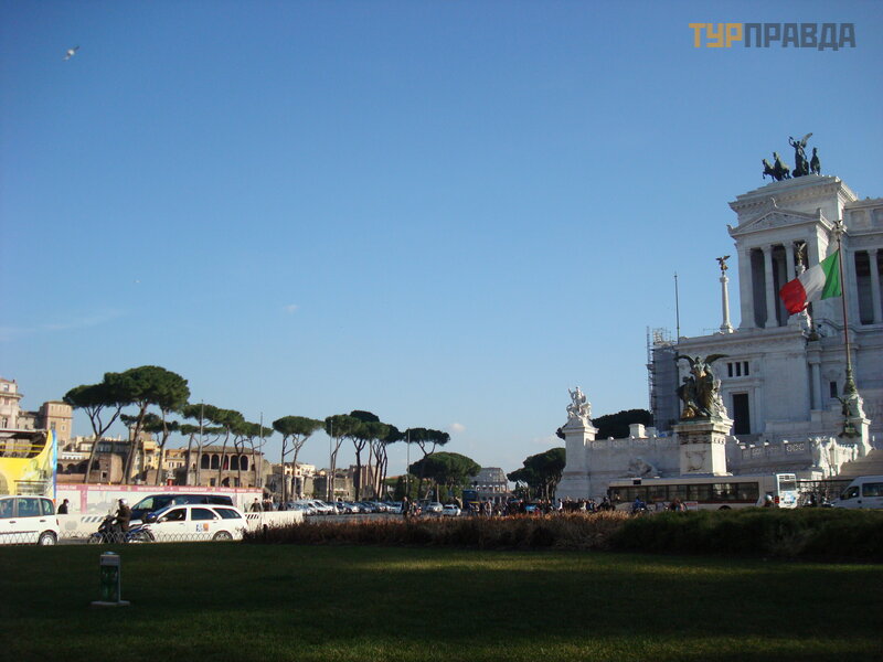 This is a pseudo-Roman-style memorial dedicated to the victories of Italy and those who died in wars with it. All this grandiose structure is impressive, we decide to go up to the observation deck, which is almost under the roof (there is an elevator to the roof, but we didn’t want to stand in a long line). I recommend, they don’t lead excursions there, but the views of Rome are something! From a bird's eye view in one direction - a panorama of Rome with a view of the Tiber and the entire Left Bank with the Vatican, the Palace of Justice and further hills, where there are parks, temples, basilicas, on the horizon - a monument to Garibaldi. On the other hand, from Piazza Venezia there is an avenue of ancient Roman forums, excavations and the Colosseum.