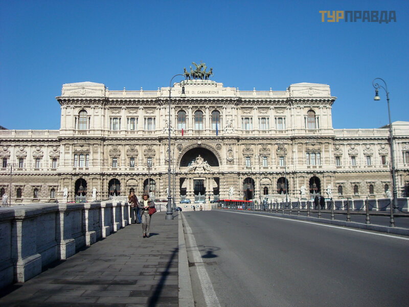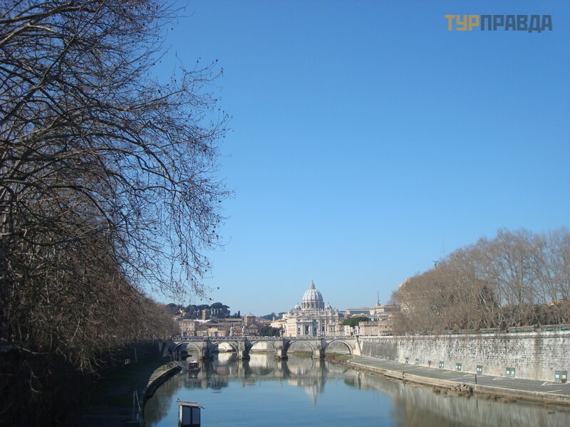 It's still early. The area is not crowded with tourists, musicians, artists paint pictures, a whole vernissage. We looked into the church, for which she thanked us with a scattering of trifles, we returned the trifle to her, even gave Eureka, the money had become “holy” after all. We walked around the square, of course, a photo session is a must. Then we move towards the banks of the Tiber to the embankment. On the opposite side of the Palace of Justice, we remove the palace from the bridge, a view of St. Peter's Cathedral.