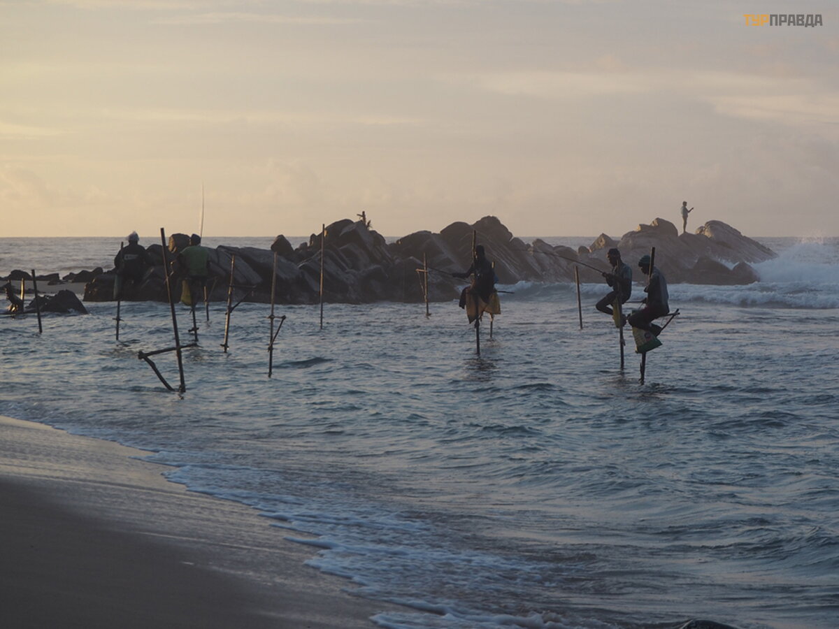 Amazing tradition. Pole fishermen are one of the hallmarks of Sri Lanka. You can often see images of fishermen on T-shirts, paintings, souvenirs. And from the fishermen themselves, such places with poles in the ocean are not so easy to find.