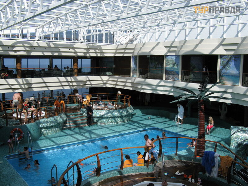 we are aft and up to the solarium on the Sun deck (18 deck), children are not allowed to go there, there are a lot of sunbeds, there are also wicker "baskets" with mattresses, where it is quite cozy, there is a jacuzzi , and to the pool and bar nearby on the 15th deck.