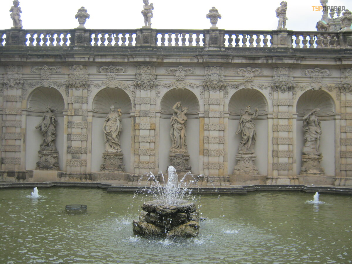 The structure is made in the Baroque style, decorated with 6 figures of nymphs and a figure of a dolphin pouring water. And above the Zwinger, along its entire perimeter, walking galleries with beautiful statues were built.