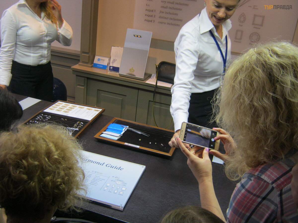 The most inexpensive pebble starts from 240 euros and its weight is not even measured in carats! After a short master class on diamond processing, our group is taken to a separate room, where they take out a variety of pebbles, both separately and in products. Some products are quite affordable: for example, a watch with one small diamond costs 100 euros. But the best part, especially for women, is that all jewelry is measured, no matter how much money you have in your pocket. Such is the publicity stunt! Our group has really hung out there! Many, it turns out, like to measure!