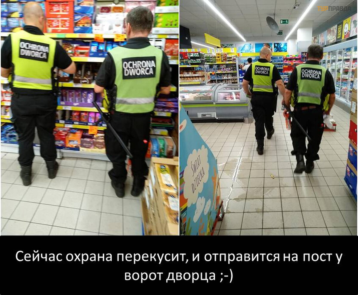 On the way we went to the supermarket Dworzec Centralny, where we buy delicacies (meat and sweet), juice, a couple of jars of tuna and more. We walked around the hall, two supermarket security guards passed in front of us, everything would be fine, but the inscription "OCHRONA DWORCA" on their backs made me laugh, and I couldn't help but take a couple of photos. We go out, and on the move, absorbing food, we set off.