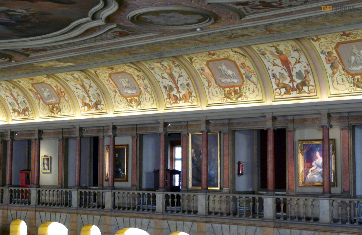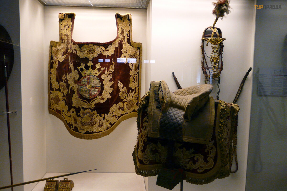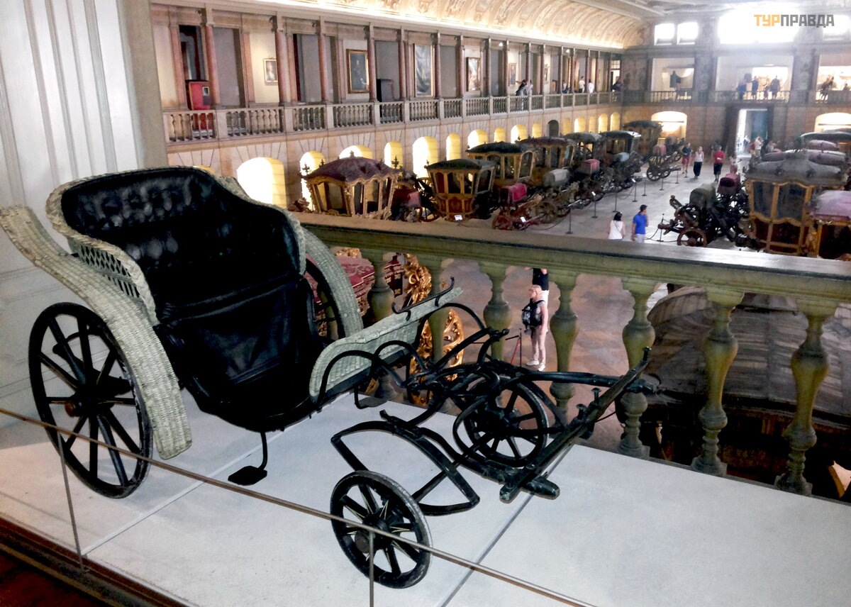 In the upper part of the arena there were stands connected by narrow galleries, and at both ends of the building there were balconies for the judges and the royal family, from where they watched the competitions. Now in the upper part of the hall there are prams, pony carts, charabans, landau, as well as various intricate accessories for horseback riding - spurs, saddles, harness and uniforms. The walls are decorated with portraits of members of the royal family.