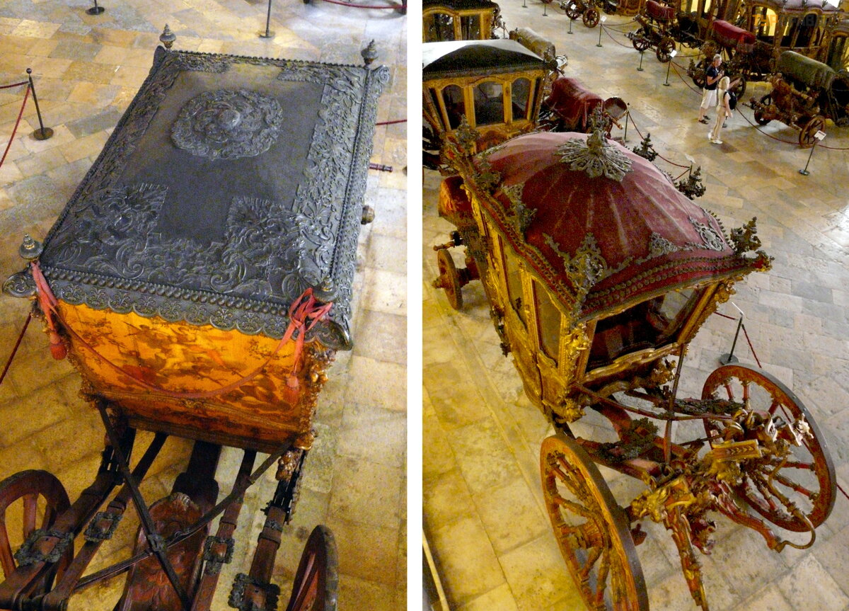 В конце зала стоят три огромные барочные кареты, изготовленные в Риме для посла Португалии в Ватикане: в 1716 году король Жоао V отправил большое посольство в Ватикан. К тому моменту лучшие времена португальской империи были уже позади, но тщеславному монарху хотелось пустить пыль в глаза Папе Римскому и продемонстрировать, что и на краю Европы живут не « Бог знает кто» . Для этого в Риме было заказано пять роскошных карет, выполненных по эскизам португальских художников, три из которых сохранилась до наших дней.