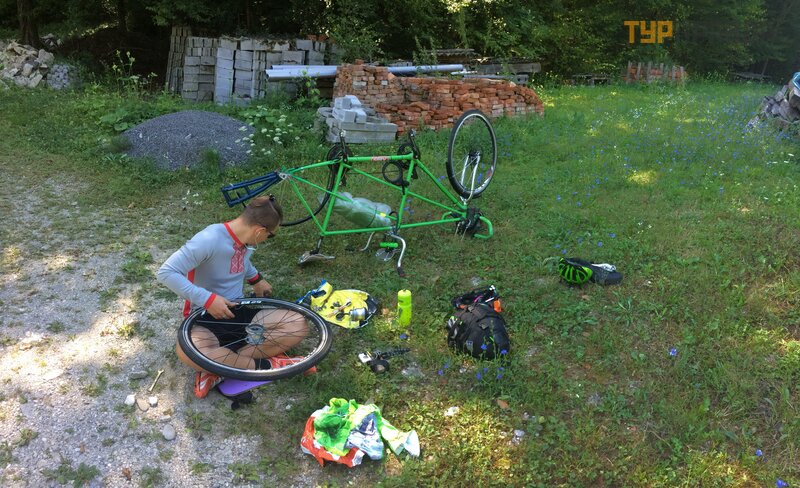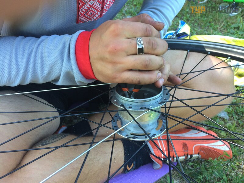 Having cooled the sleeve with water from a flask, we manually tarakinil led to the end of the descent, where Vanya began to study the problem. Thanks to our friends from the Zaporizhzhya store FUTEN for the light tools from Neko, who helped us fix the bike.