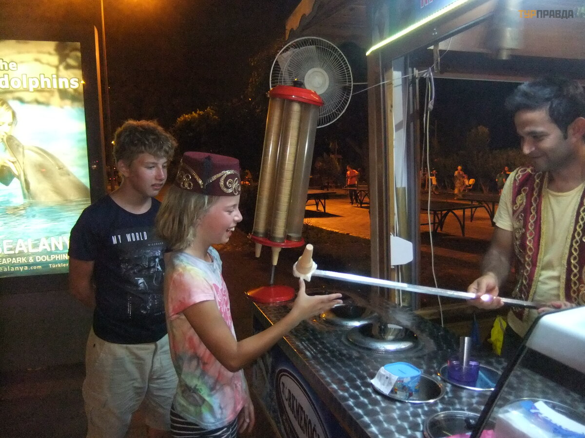 But entertainment doesn't have to be expensive. And my dreams came true. We found in Alanya, not at all in the center, a real Turkish ice cream virtuoso. It was exciting and very inexpensive.