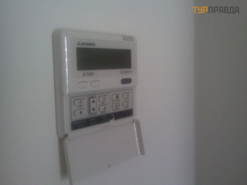 First, we went to the parents' room, as it was on the first floor. Having opened the door with a card, which did not need to be held here, but only brought, we entered. The number was immediately approved unanimously! Large bed, central air conditioning with remote control on the wall, panoramic window and balcony. Looking ahead a little, I’ll say that parents are lucky! They got a room on two sides - a window overlooking the hotel "Vera Mare" (the one that does not accommodate single men), and an elongated balcony overlooking the sea!