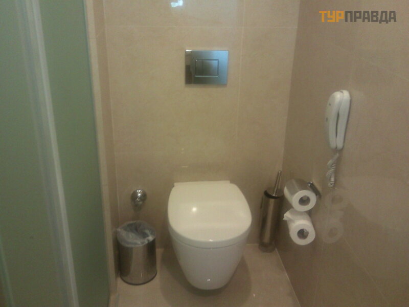The rooms had a large sink, hair dryer, shower accessories, towels and even a telephone in the toilet!! ! The bathroom here was separate, there was no bath, but there was a shower - a hand shower and a large one on top.