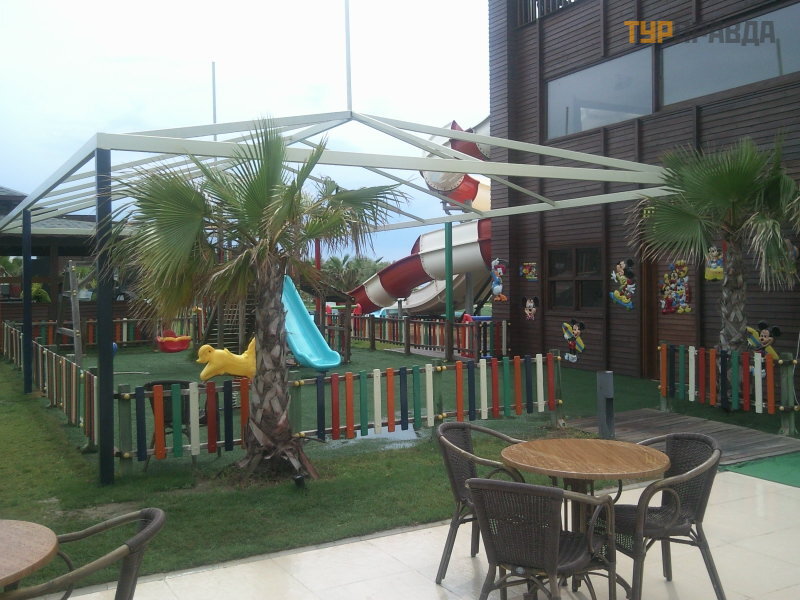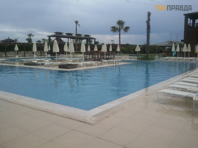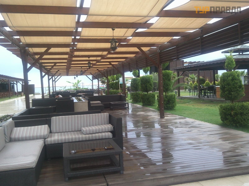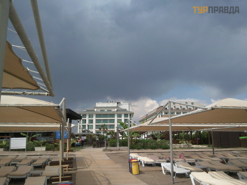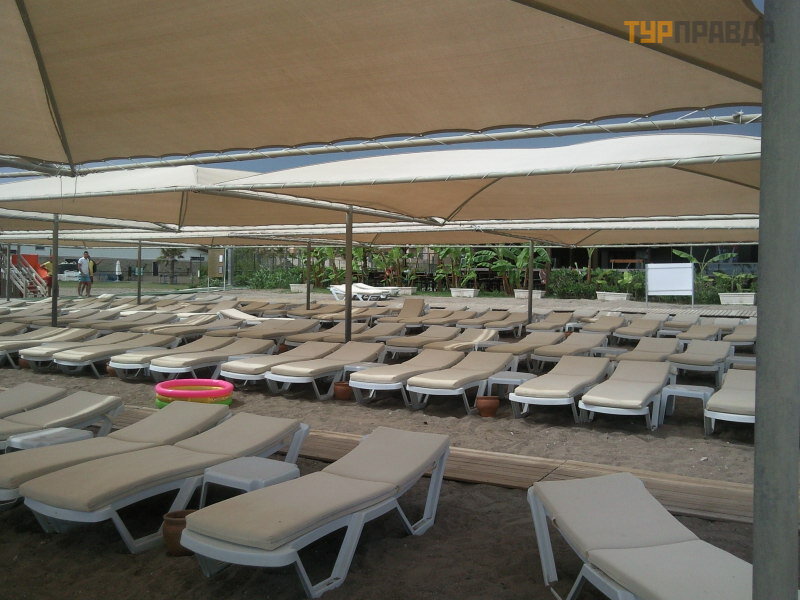 " There was a swimming pool, two bars, entertainment for children, a stage for animation, several shops and a hairdresser. The beach was sandy with sunbeds and awnings, urns for dishes and ashtrays. Water activities were offered to all hotels at once, but on this day they did not work - the weather was bad and the sea was cool.