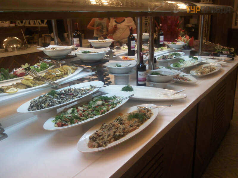 The main restaurant "Ambrosia" was located on the ground floor and there was an exit to the street for those who wanted to eat outdoors. We had food, as in all good "fives" - "UAI, ultra all inclusive", a buffet, of course. Loved the food and selection. Other than that, I didn't expect anything else. The waiters poured wine themselves from bottles, and brought cola from the bar, which was located in the lobby at the entrance to the restaurant.