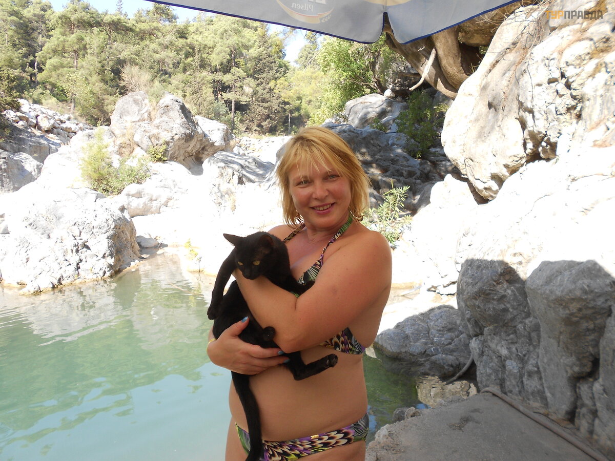 Первая остановка – возле горной речки. Почти вся группа полезла купаться, температура воды 12-13 градусов никого не испугала. После такой адской жары самое то оказалось. Я даже кота потискала, люблю я их)))
