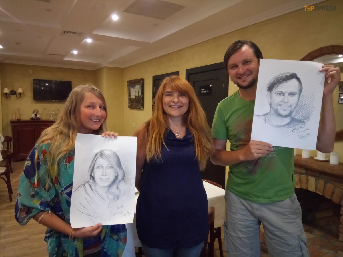 After the Pochaiv Lavra, we were met by a local artist Valentina. And while the rain rustled outside the window, Valentina's pencil rustled on the paper. And we got our portraits.