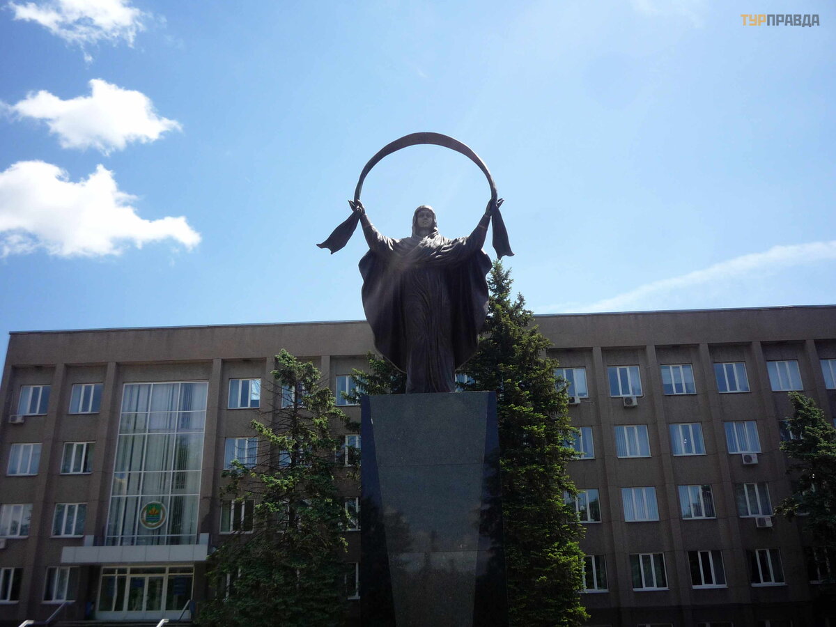 It's hot outside. Although it's not far to go. Ten minutes and a stop at the Pokrovsky District Executive Committee. In front of him is a chic square and a five-meter bronze statue of the Virgin. The master expanded the church vision of the Intercession and made the monument more modern.