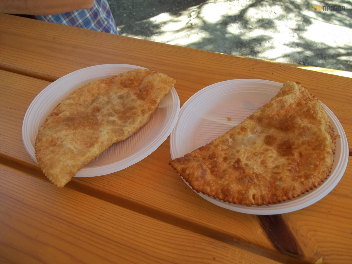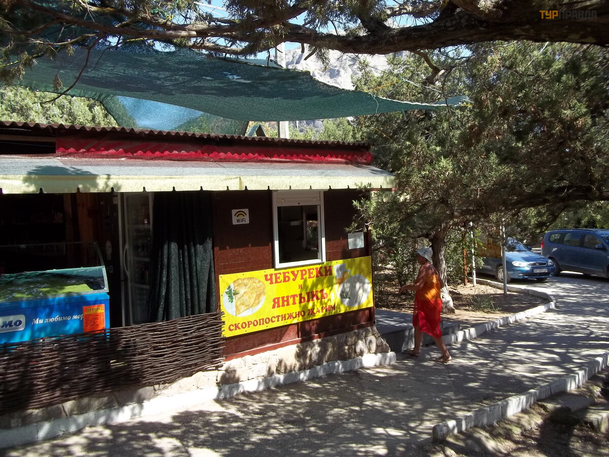 Well, I say, have you flown? The boys say - no, it's better to go! They began to look for a safe path. It is difficult to do this on bare rocks. We poked and poked around, seemed to find it, and she led us into such chagarnyks! Just imagine - a very steep slope with loose, overgrown with dense undersized forest with sharp knots, striving to spoil the skin, covered only with a very conditional swimsuit. But on the other hand, you can at least grab onto the branches so as not to move out on your ass. God bless, and we descended relatively safely. We reached the source, this time deserted (the weekend had already ended and the people subsided a little). We plunged, got some water, and - in the village - to relieve stress. We didn’t earn champagne today, we didn’t go much, so we managed with beer. At the local market began to choose a fish. We settled on smoked flounder, with a belly full of caviar, 600 re per kilo. In our country, it also costs quite a lot - 100 UAH / kg fresh, but I have not seen smoked at all. This was the reason for my choice. Good but not enough. We ate another cheburek for 70 rubles.