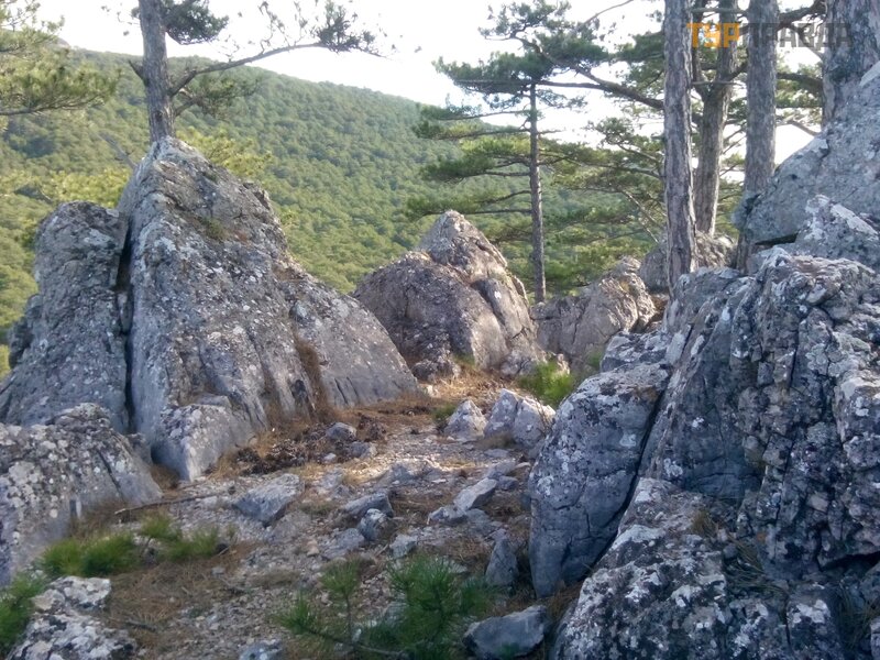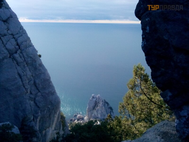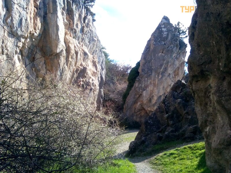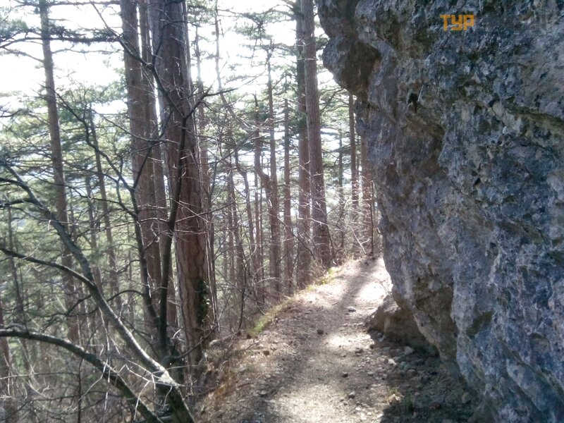 And the next day was the eighth of March! On this occasion, as well as on the occasion of insanely painful legs, we decided to confine ourselves to a light walk. Its object was to be the Nikitsky fault. I found a description of this attraction here, on Turpravda. But no one has been there yet. It was necessary to fill the gap! According to the Internet, it should have been somewhere very close to the highway. Having arrived on the 29th bus, next to Nikita, to the Shkola stop, we crossed the road and went somewhere. No crack was visible. Something long we go! And the path is narrow. And in this cleft, judging by the descriptions, the films “Children of Captain Grant” and “Sportloto-82” were filmed. But how did they bring equipment and artists? Then the path smoothly merged into a wide road that led us to the rock. We climbed it. Beautiful, but not that!