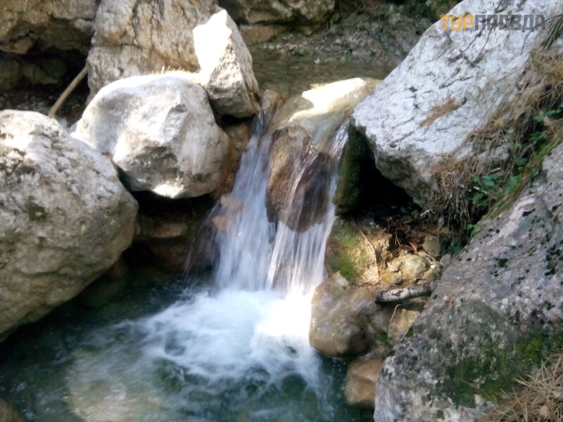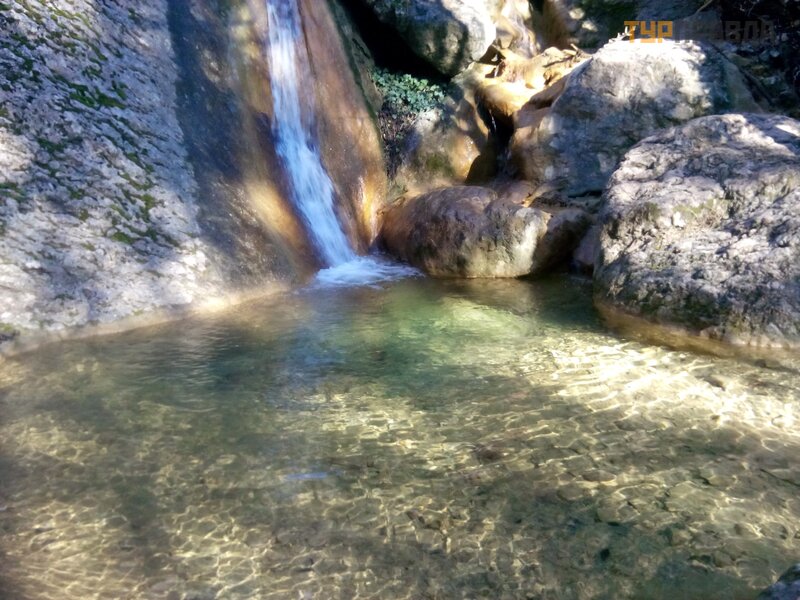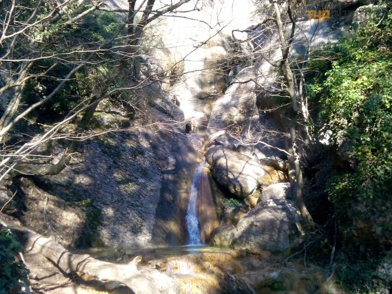 On the second day, a completely new route was assigned, found on the Internet. We were to enjoy the waterfalls in one of the gorges above Yalta. But to get there, you have to sweat. The description of the route with photos was printed out. I knew before that somewhere, over the Sevastopol highway, you can climb and always looked out for trails, driving a minibus in that direction. But the approaches to the mountains were built up with all sorts of different huts, and it was completely incomprehensible how to seep into the mountains. And finally it happened. We are going there. After crossing the highway, we went along the route. We passed the service station, some dachas, went along the river. Seeing a woman with a dog on the shore, we decided to clarify the route. Turns out we left early. We had to turn around for the next gas station. Well, it's okay, it's possible. The woman very intelligibly explained to us how to find the gorge we were looking for. Having rounded the vineyards and passed through the forest, we finally reached the path described in the printout. We found the lower waterfall without any problems.