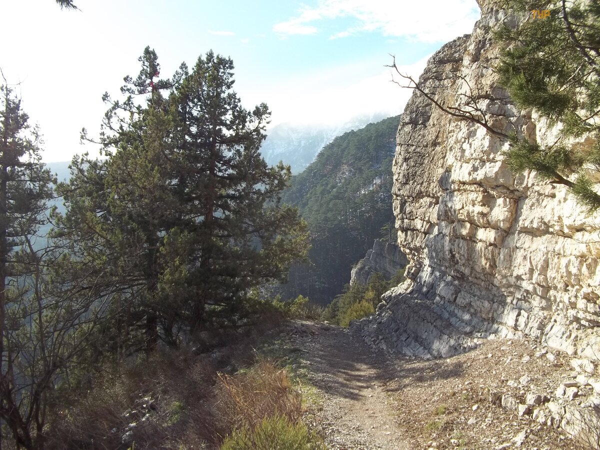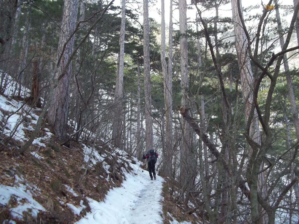 But there is nothing to do. We started the ascent. Close up, the rock, which seemed slightly powdered from a distance, was fairly covered with snow. The trail is not fenced in places and is very icy.