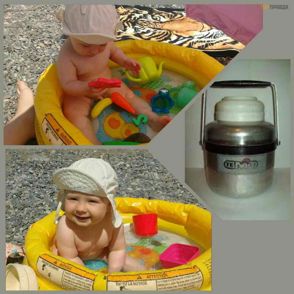 Spa procedures Polya and I arranged in the children's pool on the shore. For them, we took water from the sea and diluted it with hot water from a thermos. We have a very funny and cumbersome, Soviet one, which we affectionately nicknamed R2D2, fans of the Star Wars movie will understand me.
