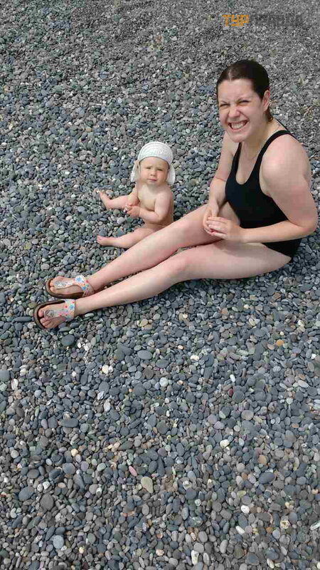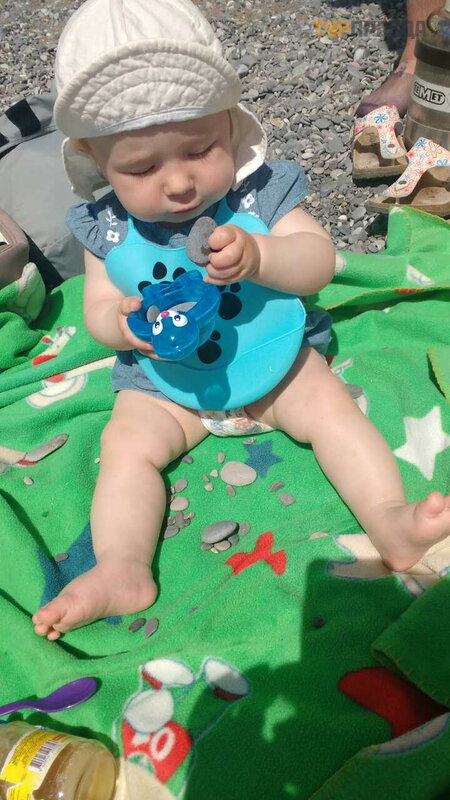 In the following days, we were no longer afraid to bathe the child, even with diving. After that, we slowly moved to the beach almost to live. We had breakfast there, bathed toys, crawled, tried all the pebbles on the tooth and just rested. In general, a pebble beach is the best choice for a small child, especially for an explorer like our daughter. It is very useful to crawl on the pebbles, and also start learning to walk on them, as we did.