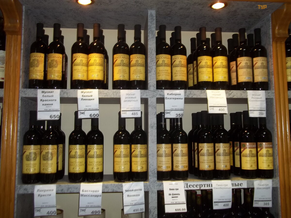 It didn't rain in the morning, but it rained at night. It was not worth starting a serious trip today - and it's dangerous and we're hustling like pigs. We decided to take a light track in the gorge of three mountains. But first, on the way you need to run into the winery. It's already Tuesday and the second company store should be open! Taki worked! And the prices! My dear mother, where have we been before? Like in the good old days, New Year's discounts. Of course, port for 38 hryvnias is not at all the same as for 400 rubles. But compared to the prices in Yalta stores, it is very humane.