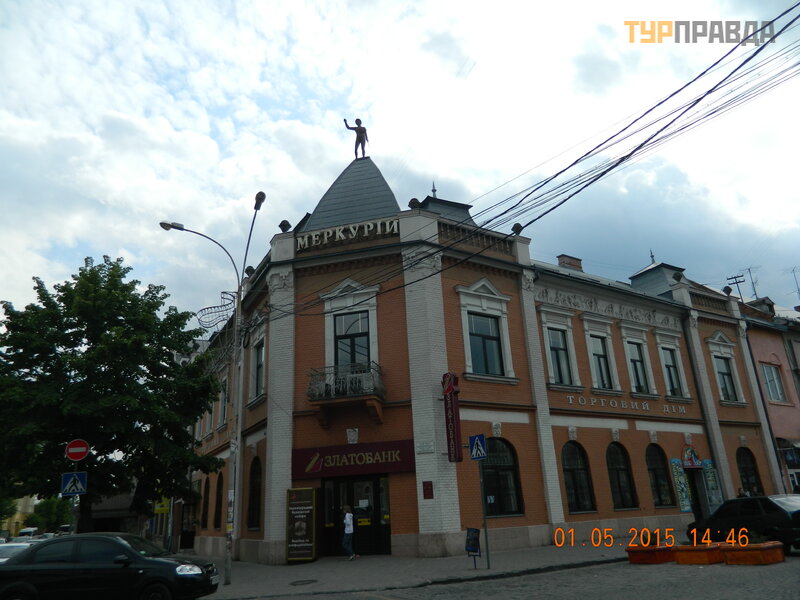 And another interesting architectural object. The house with Hermes on the roof is a former printing house of the entrepreneur Greenstein. According to legend, Greenstein won a million in Europe, either in a casino or in a lottery, and used this money to build a printing house. At that time it was one of the most progressive printing houses in Transcarpathia.